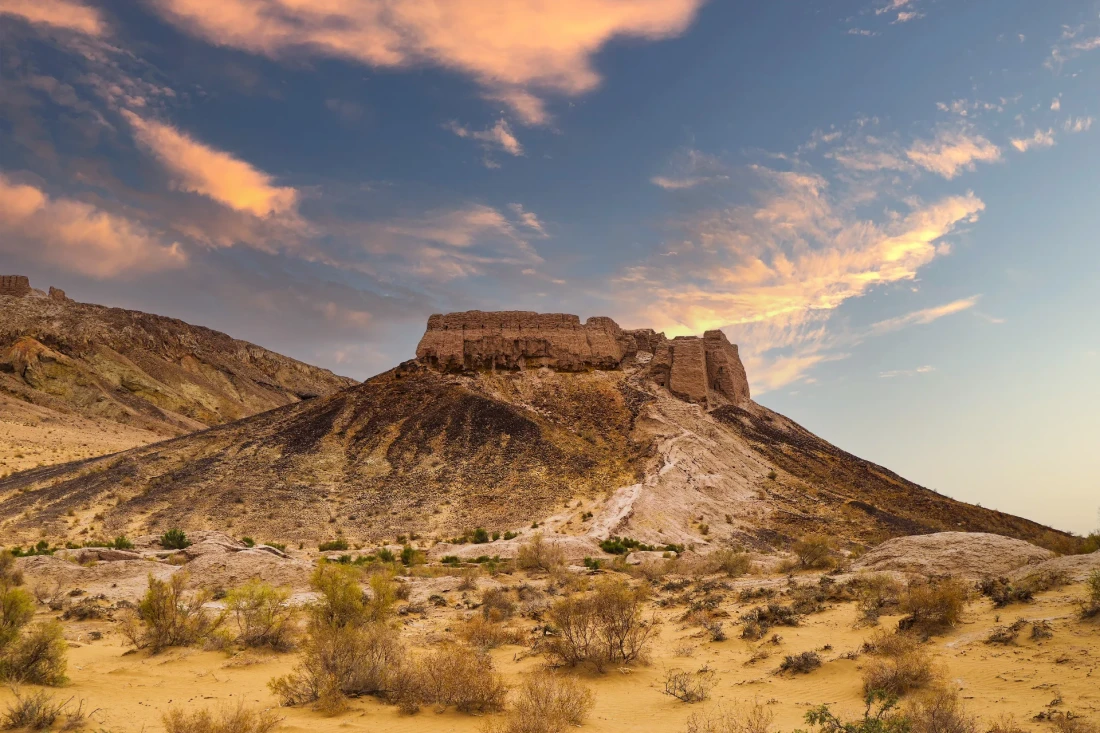 Аяз-Кала – это крепость, которая находится в песчаных дюнах Кызылкума, примерно в 20 километрах к северо-востоку от Топрак-Калы. Она расположена у подножия священных гор Султан Увайс. Этот исторический памятник представляет собой огромный курган, возможно, возникший еще в IV веке до нашей эры. Стены крепости ориентированы на все четыре стороны света, а к единственному входу можно попасть через лабиринт, который находится с южной стороны. По местной легенде, во времена великих потрясений, когда умер предыдущий правитель, возникла необходимость выбора нового. Толпа собралась, и жрецы предсказали, что новым правителем будет тот, на чью руку сядет королевский сокол охотник. Однако, судьба сыграла злую шутку, и птица села прямо на голову простого солдата. Сокола быстро прогнали, но он вернулся и сел на голову солдата еще раз и народ решил, что это знак судьбы. Этот воин был известен своим личным вкладом в строительство нового замка на холме. Его правление было основано на принципах долга и справедливости. Чтобы всегда помнить свои скромные корни, король приказал повесить старый изношенный сапог на видном месте перед троном.