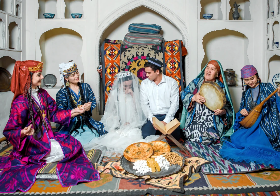В узбекских семьях традиционно большое значение имело убранство жилого помещения. Обычно пол застилался ковром, на котором лежали курпачи (узкие стеганные одеяла). А посреди комнаты расстилался дастархан со всевозможными угощениями, фруктами, сладостями и обязательно со свежеиспеченным хлебом. В гостиной были разложены красочно вышитые подушки, а сундуки с курпачой были покрыты богато вышитым сюзане.