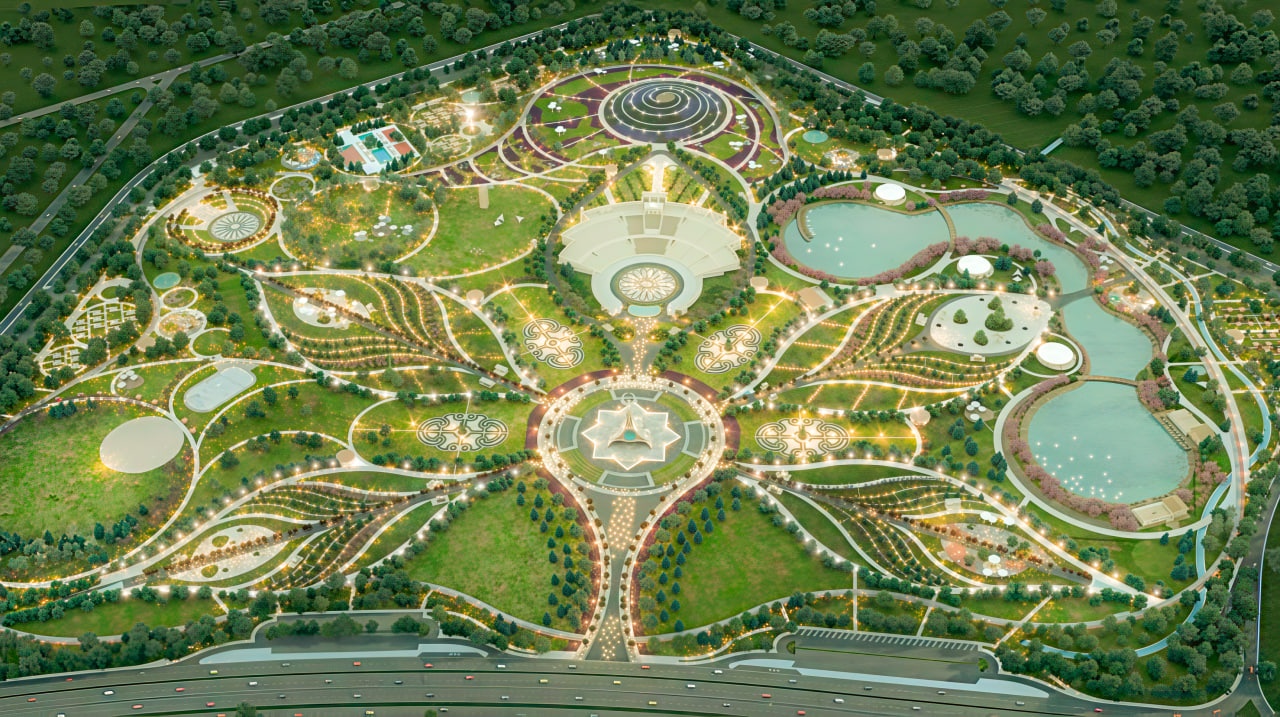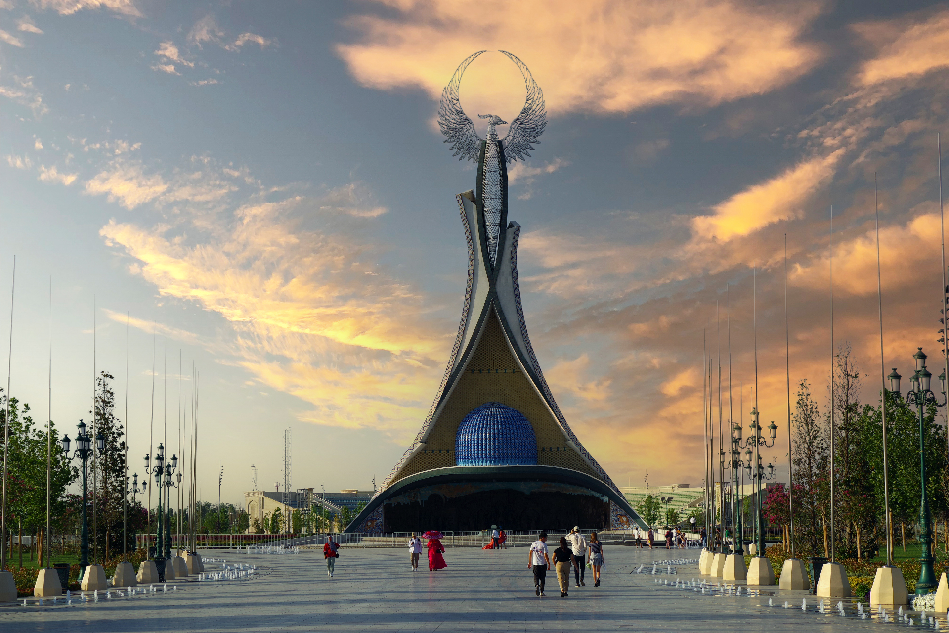 Центральным звеном парка является Стела Независимости – величественный монумент высотой в 60 метров. Монумент венчает стилизованная птица счастья Хумо — символ мира, процветания и свободы.